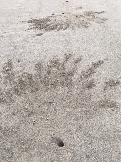 砂にできた穴は、蟹さんの住処です。同じような大きさの穴がたくさん出来ていますが、もう暫くすると海亀が上がってくるでしょう。